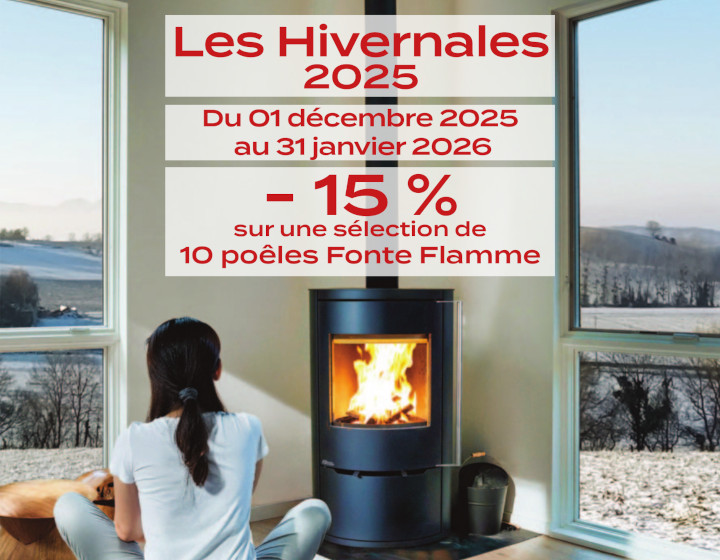 Promotions du 01 décembre 2025 au 31 janvier 2026. Une remise de 15% sur une sélection de 10 poêles Fonte Flamme. Profitez de nos "Hivernales" en cliquant sur le bouton ci-dessous.